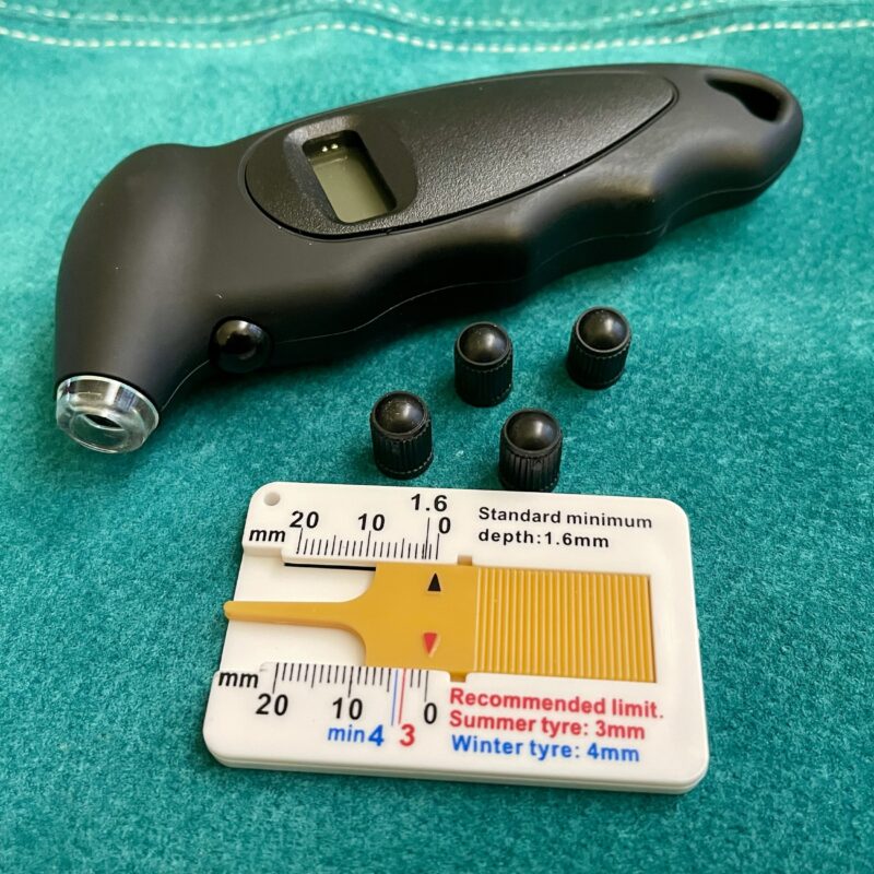 Valgustusega digitaalne rehvirõhu manomeeter. Komplektis ventiilikorgid 4x + rehvimustri sügavuse mõõtja 1x