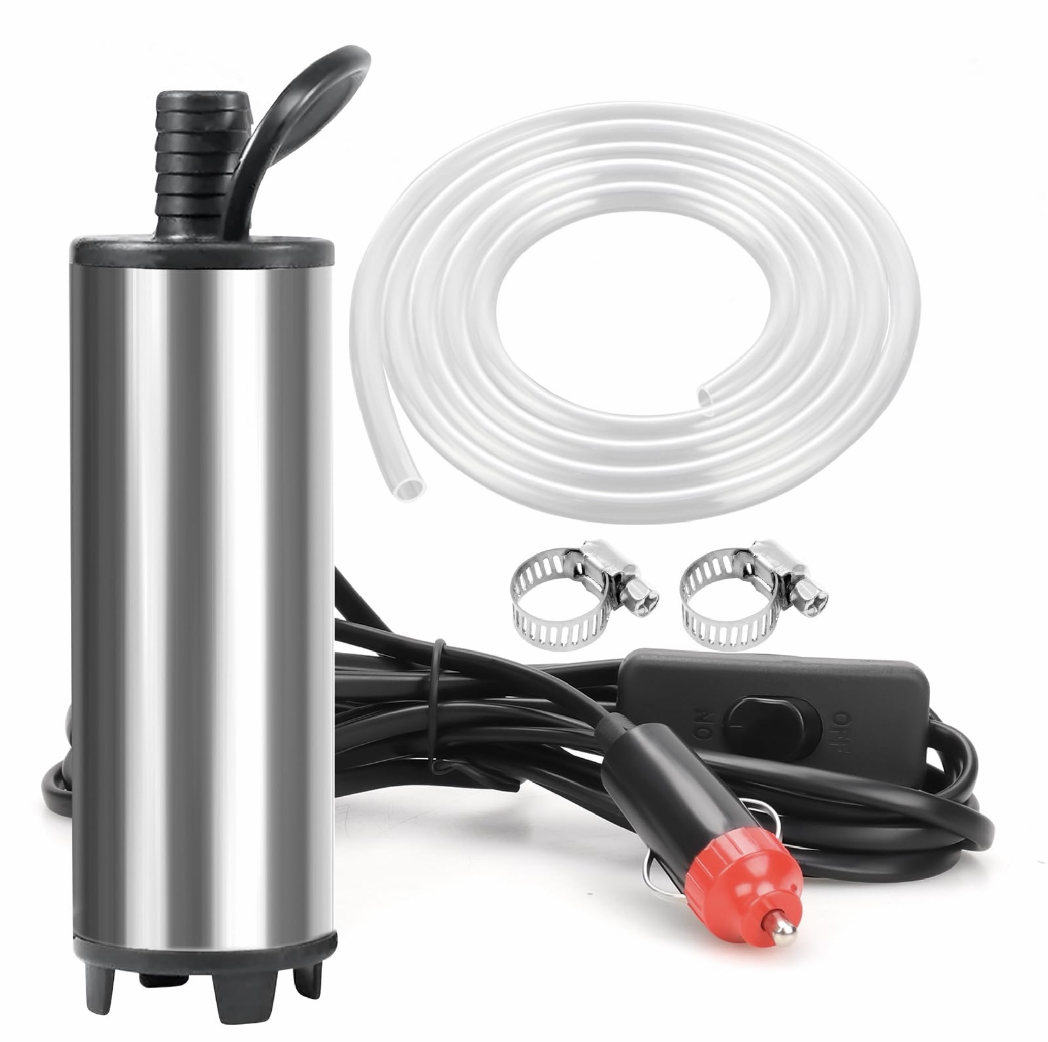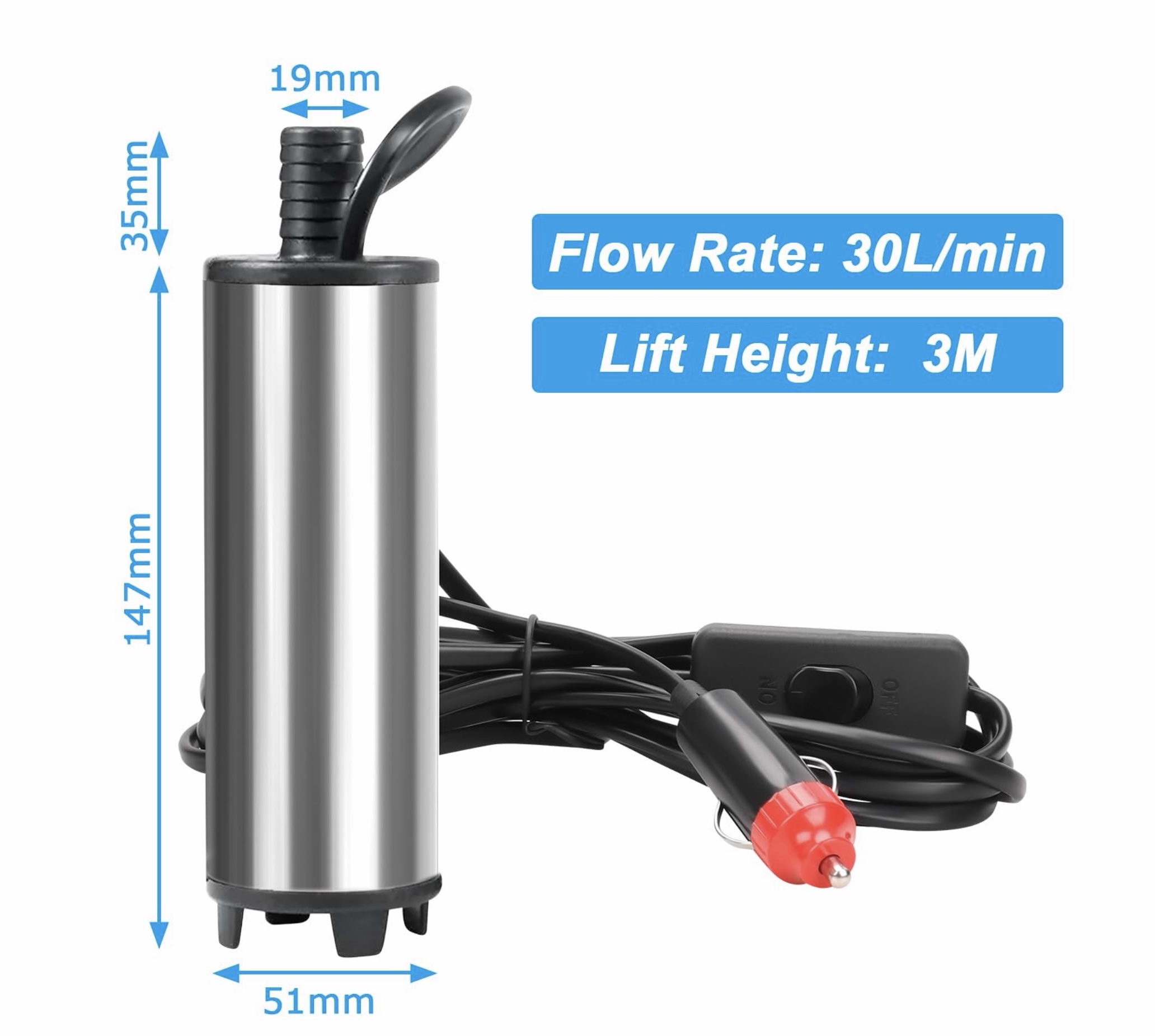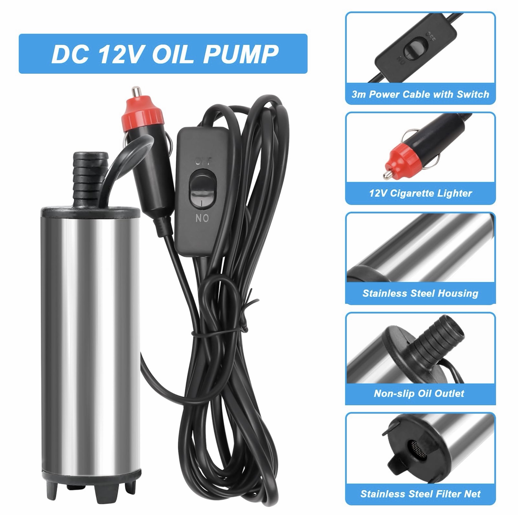 Sukelpump vaadipump õlile või diislile, 12V, lülitiga 3 meetrine toitejuhe, vooliku diam. 19mmm. ja pikkus 5m. 30L/min.