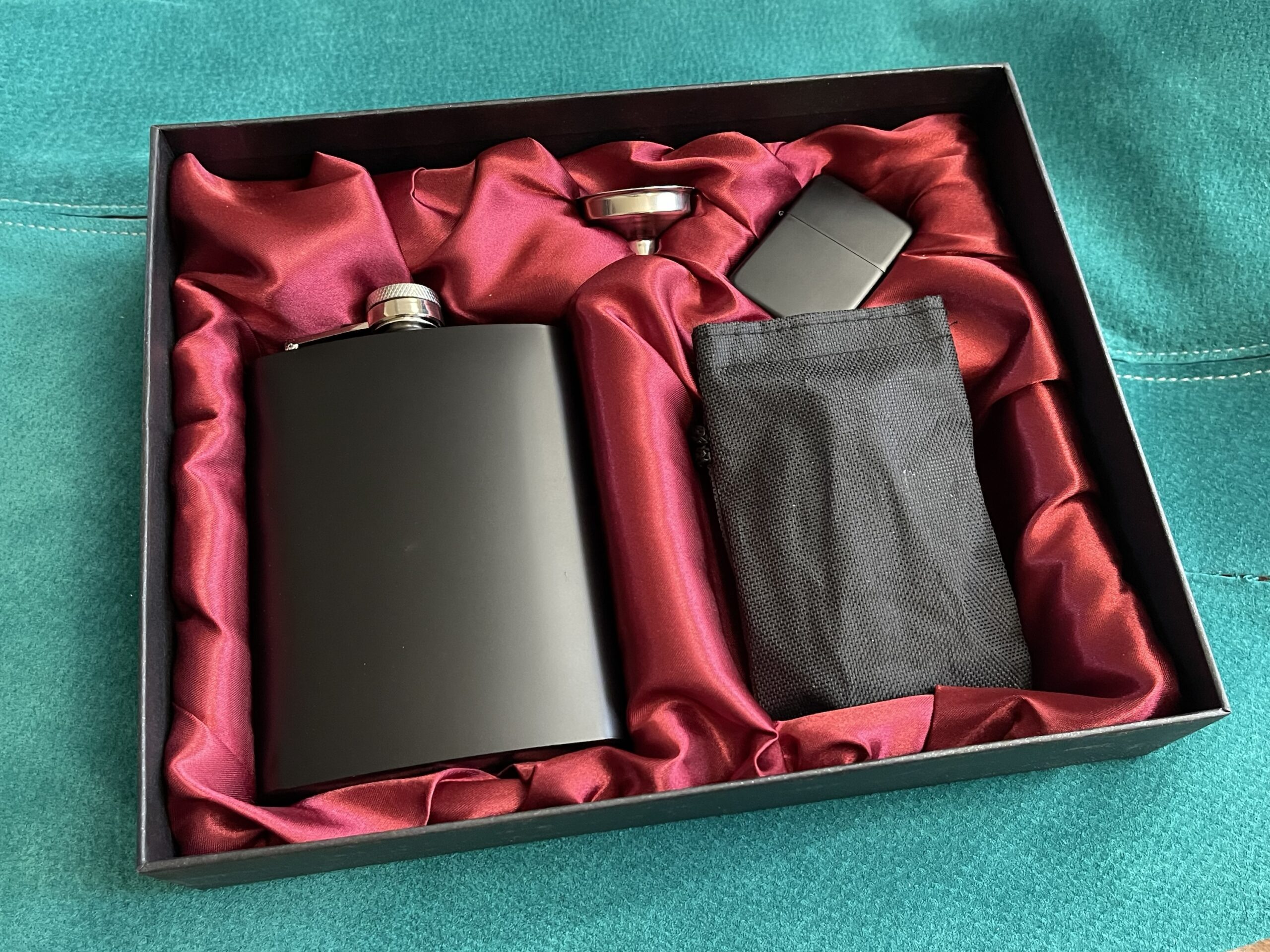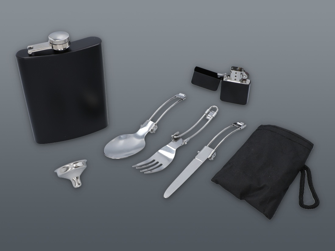 Kinkekomplekt sisaldab roostevabast 8 OZ (240 ml.) taskupläskut, lehtrit, ZIPPO stiilis välgumihklit/tulemasinat ja kokkupandavaid nuga-kahvel-lusikas