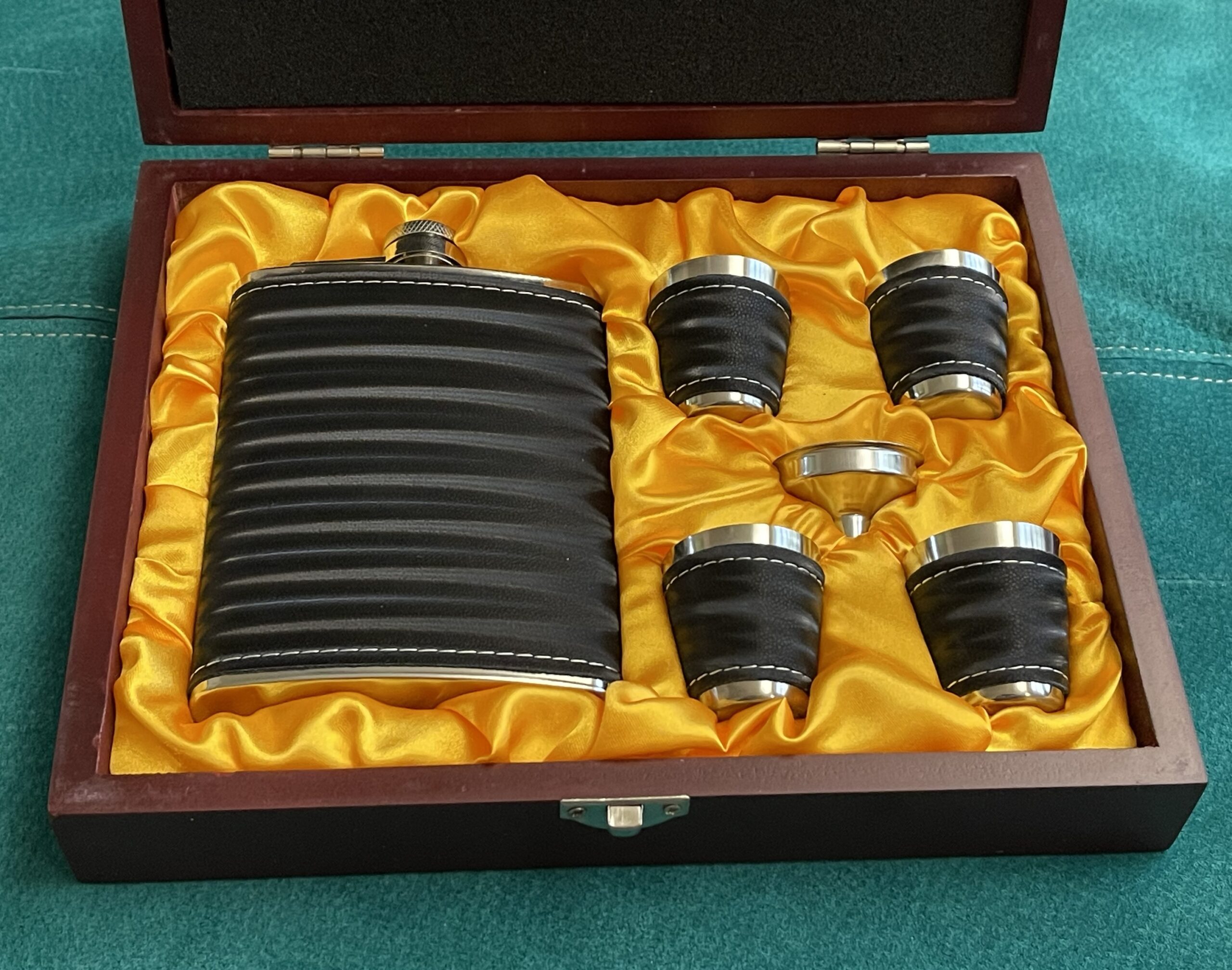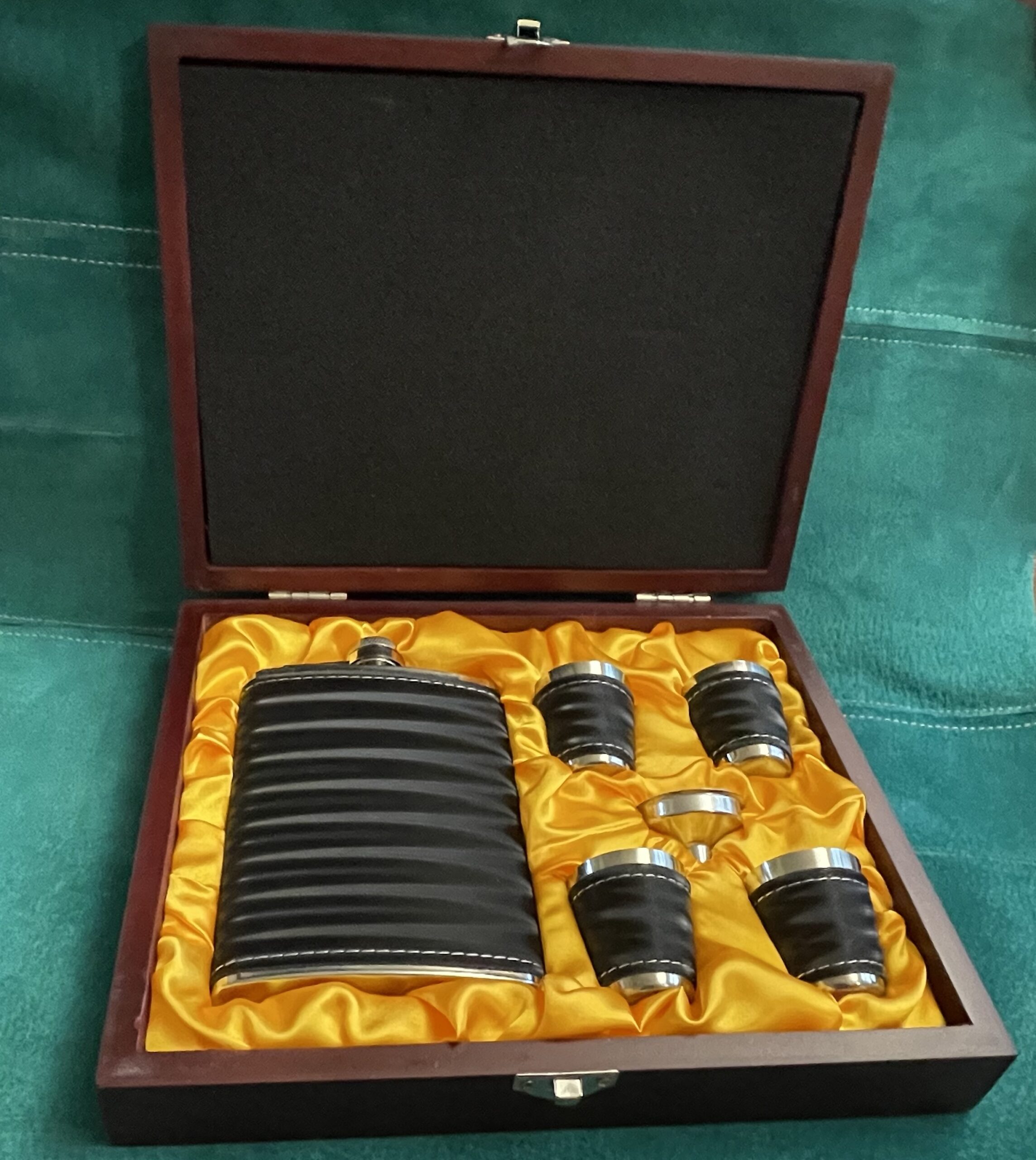 Kinkekomplekt elegantses puidust karbis mis sisaldab roostevabast terasest 8 OZ taskupläskut- 240 ml, 4 (4 x 35 ml) pitsi ja lehtrit.