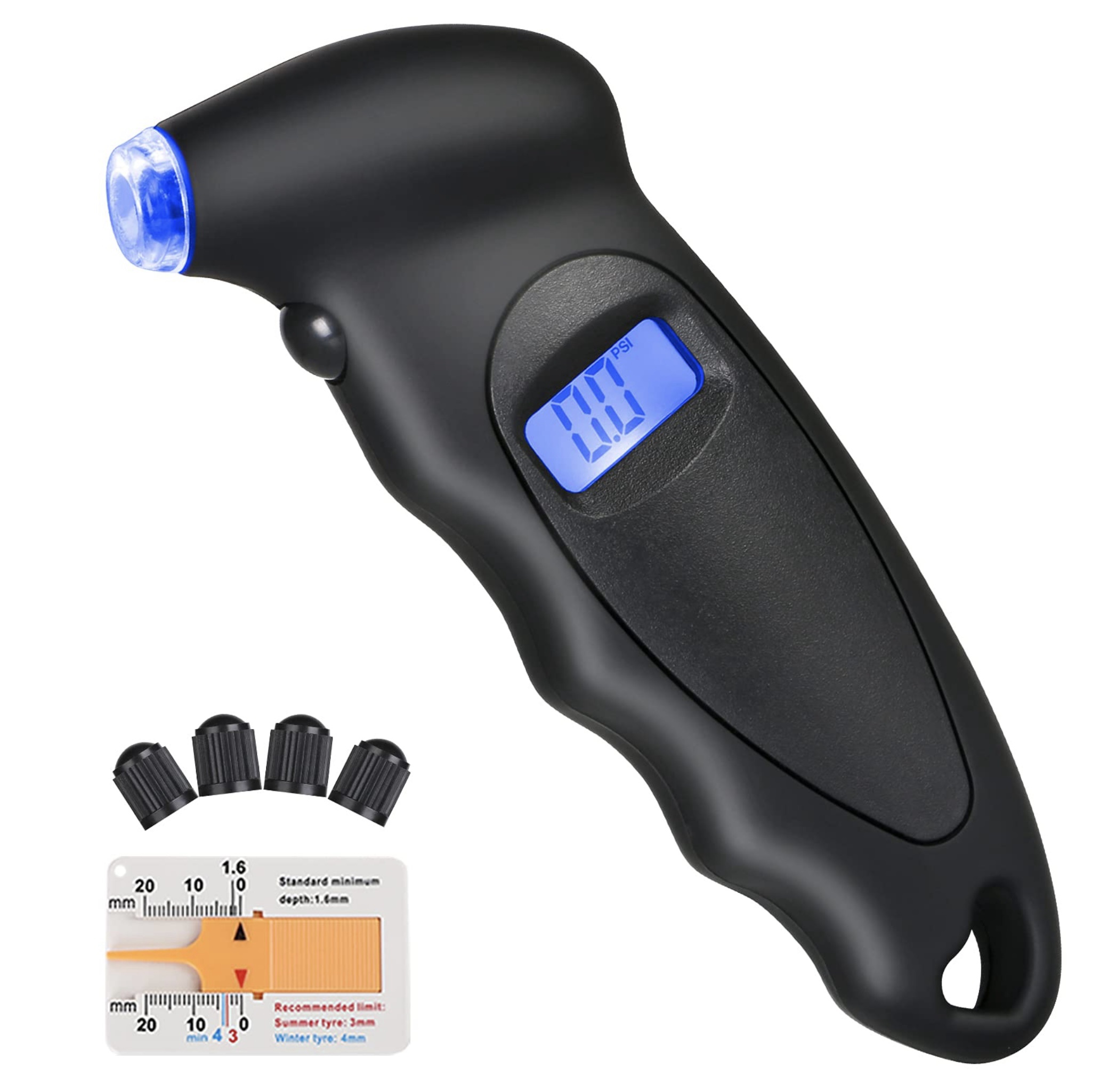 Valgustusega digitaalne rehvirõhu manomeeter. Komplektis ventiilikorgid 4x + rehvimustri sügavuse mõõtja 1x